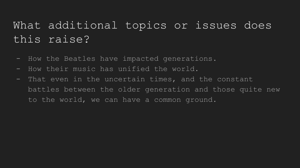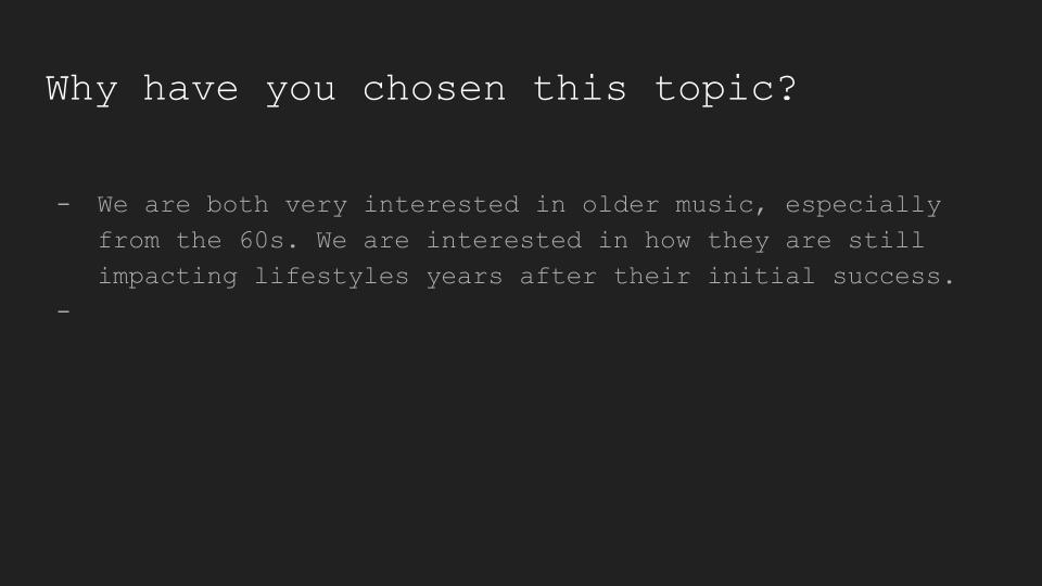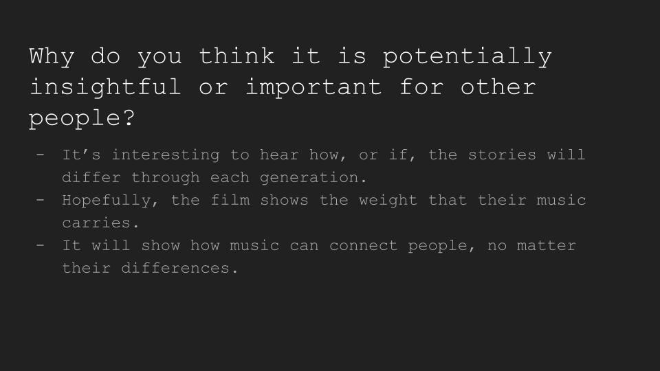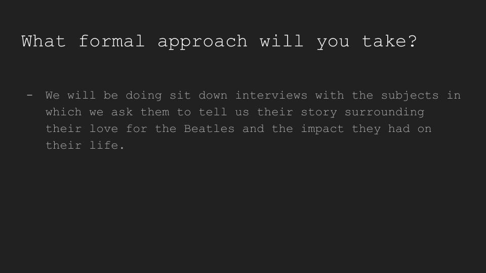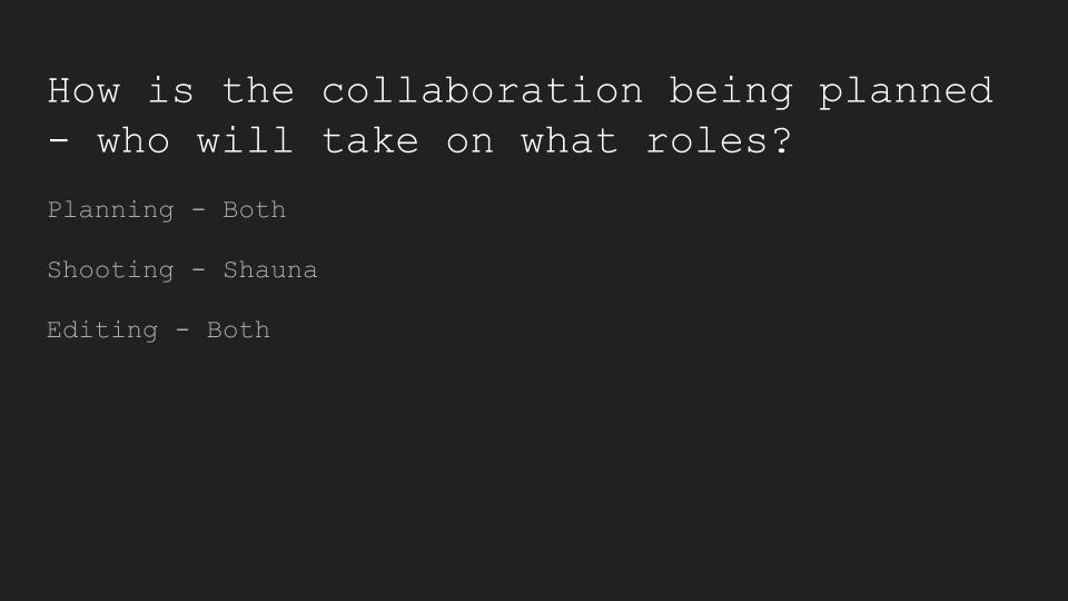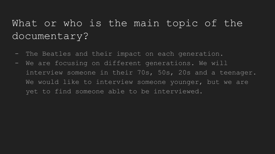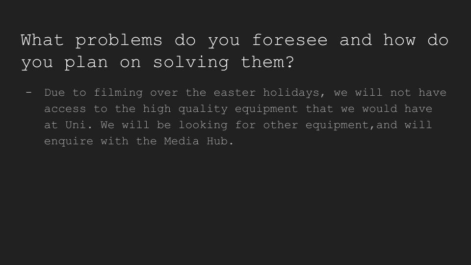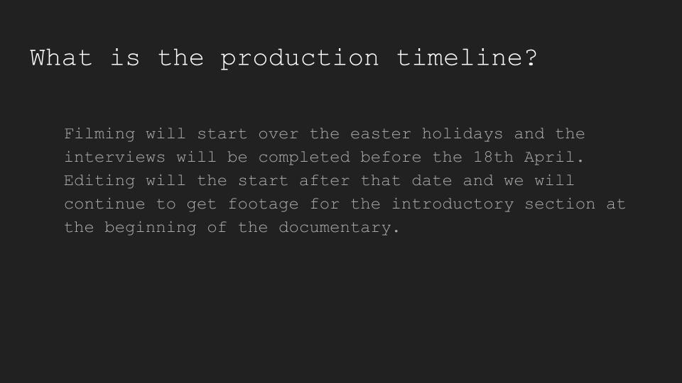 When writing our presentation it was easy to think about the general baseline for our documentary. Obviously not knowing what was in store with Covid-19 we did have a solid. idea before and then once we were separated we just changed the idea slightly. This meant that what we wrote in our power point mostly still corresponds with what we actually made.